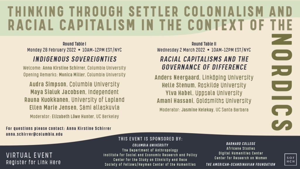 In late February and early March of 2022, I arranged and hosted a two day round table event entitled “Thinking Through Settler Colonialism and Racial Capitalism in the Context of the Nordics” at Columbia University. Scholars in this round table discussion thought through the terms of racial capitalism and settler colonialism in relation to their own work and in the context of the Nordics exploring the racial logics of transnational and transhistorical disciplinary regimes. What are the possibilities and limitations of thinking through these terms in an attempt to understand the long durée of Native dispossession, anti-Blackness, and neo-colonial/imperialist global inequalities in the Nordic region today?